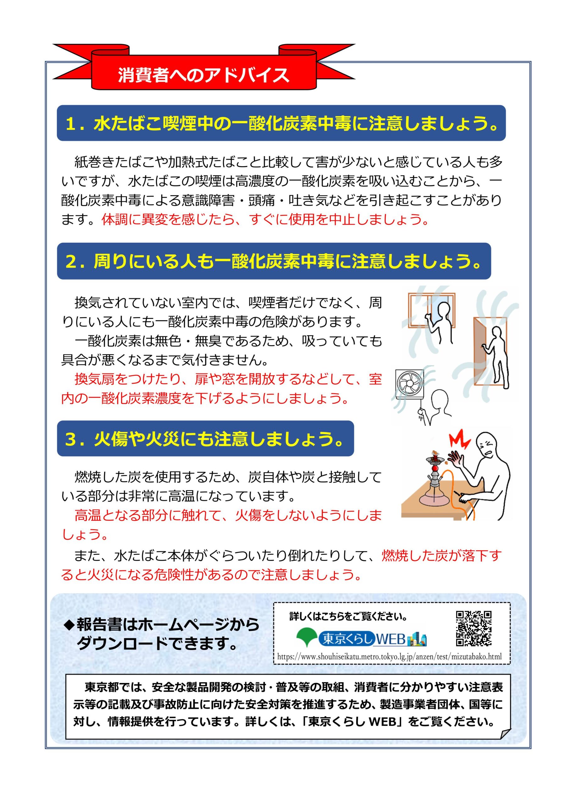 “ 水たばこは炭で燃焼させたたばこ葉の煙を水に通してから吸引する喫煙具で、都内でも多くのカフェ、バー、飲食店などで提供されているが、店舗数の増加に伴いCO中毒事故も増加傾向にある”