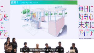 “現在、路上喫煙や喫煙所からのはみ出し喫煙が問題視されており、これらはマナーの悪い喫煙行為とされ……学生たちは喫煙者の行動を改善するための喫煙所のデザインについて検討……結果、喫煙者を壁で囲い遮断する従来の設計ではなく、壁を取り払って周囲の目が届くようにすることで、マナーの悪い喫煙者に気付きと学びを与えるという提案を提示”