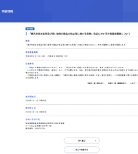 その「詳細URL」を開くと以下が出ます。題の文、「……ついてへのご意見」とは少し変ですね。“「横浜市内……について」へのご意見”とかカッコで区切るなどすればいいのにと思います。