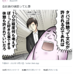 2022年11月14日 / 最終更新日時 : 2025年3月21日 受動喫煙撲滅機構 ニュース(全) まだある“タバコ休憩”・仕事サボリは許せない! なぜ許されているの? 以前はよくネット記事があったものの、しばらくないなと思っていた、仕事中の喫煙サボリの問題(→末尾に過去記事リンクを記載)。 やはりまだあるようで、ツイッターで、怒りの声が端的にまとまっています。 受動喫煙(三次喫煙 […]